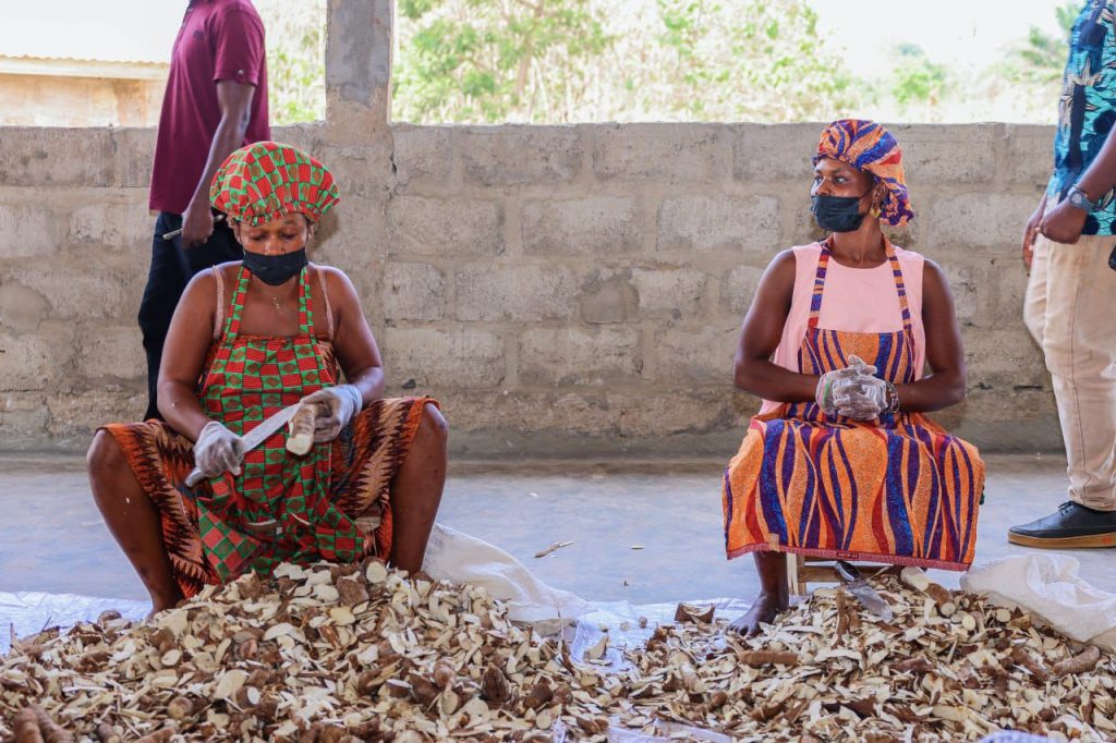 Les promoteurs ont présenté à Madame le Ministre, les différentes étapes de la production, depuis la réception des tubercules de manioc jusqu’à l’obtention de la farine finie. Ils ont souligné l’importance de cette production pour l’économie locale et la création d’emplois.